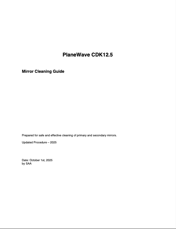 Our CDK telescope’s mirrors have not been cleaned since it was acquired two years ago. Generally, it is recommended to clean reflector mirrors every 1 to 2 years, depending on the environment. Here are the details after some challenging moments. The following outlines how the cleaning should be approached. It is very important not to deviate from these instructions or be inventive, as these guidelines are based on actual experience, and any deviation may cause damage and frustration. Let’s start with the list of items needed.