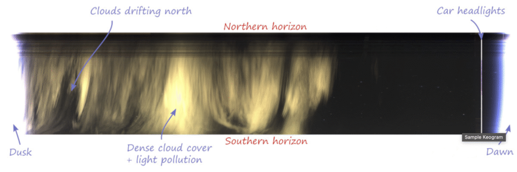 A Keogram—a single image that provides a concise summary of a night’s sky activity. It allows us to quickly assess the quality of our astrophotographs from that night. When we encounter quality issues or unexpected brightness in our frames, the Keogram helps us identify the source, enabling us to correct the problem or discard affected frames as needed.